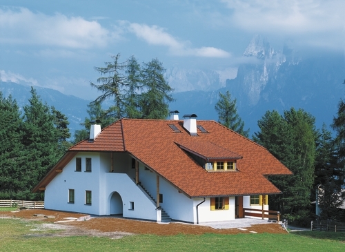 Этот вид малогабаритной черепицы своими мягкими линиями, оживленными формами привлекает внимание, являя безграничное разнообразие вариантов. Детали великолепно сочетаются, если речь идет о новых покрытиях, реконструкции крыши, частичном или полном обновлении.