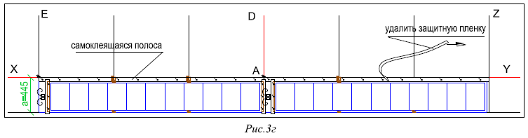 - по верхнему краю уже уложенного первого ряда панелей ТЕГОСОЛАР установите кляммеры-стопоры с шагом 96см согласно разметке (рис. 3г) и закрепите гвоздями через специально предусмотренные в них отверстия;